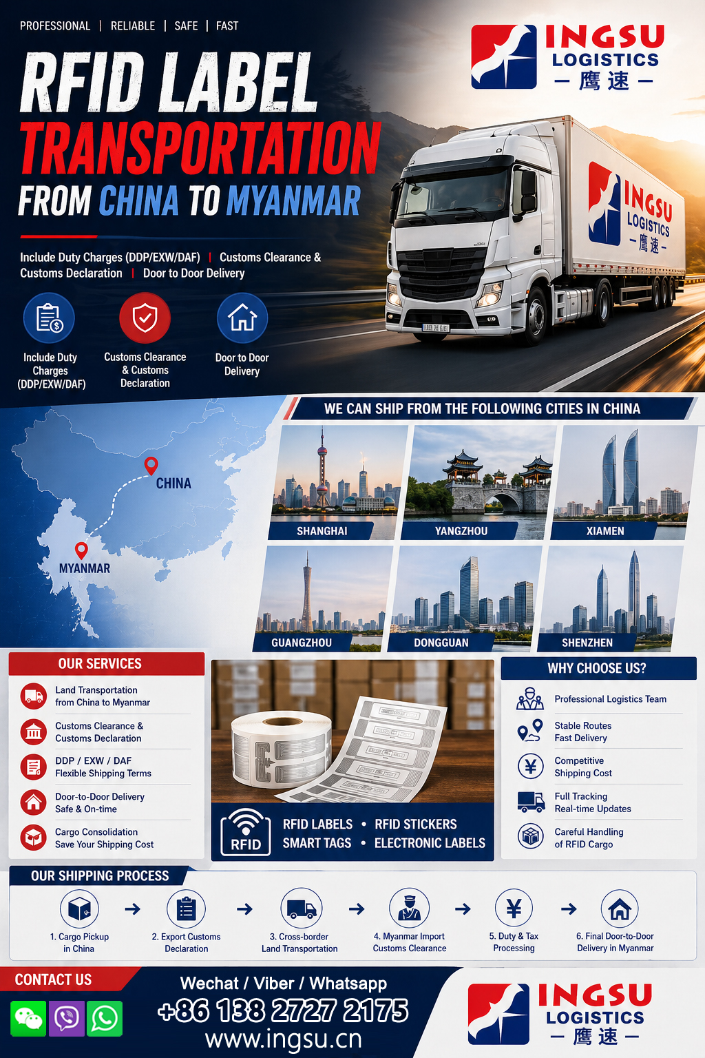 Looking for a reliable logistics company to transport RFID labels from China to Myanmar?INGSU INTERNATIONAL LOGISTICS CO., LTD. provides professional cross-border land transportation services for RFID labels, RFID stickers, smart labels, electronic tags, and packaging identification products from China to Myanmar.