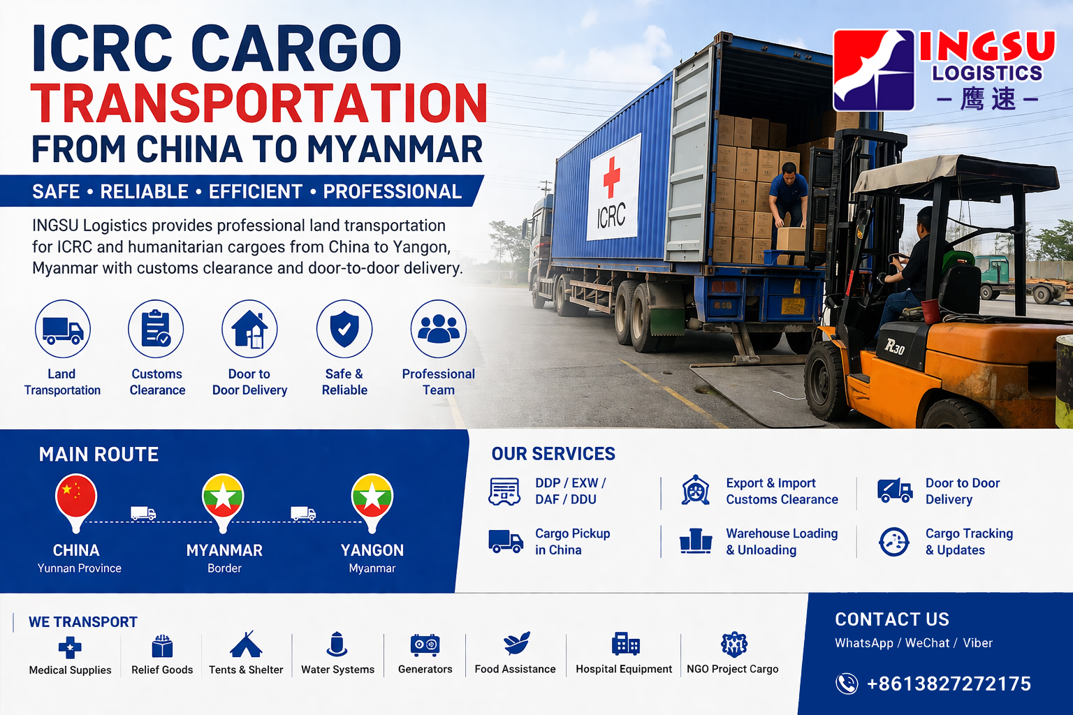 When transporting humanitarian aid and relief cargo from China to Myanmar, reliability, customs efficiency, and delivery safety are critical. INGSU INTERNATIONAL LOGISTICS CO., LTD. provides professional land freight transportation services for ICRC cargoes from China to Yangon, Myanmar, supporting NGOs, humanitarian organizations, medical projects, and emergency relief programs.We specialize in cross-border logistics solutions for humanitarian cargo transportation, ensuring smooth customs clearance, secure handling, and timely delivery throughout the China–Myanmar logistics corridor.