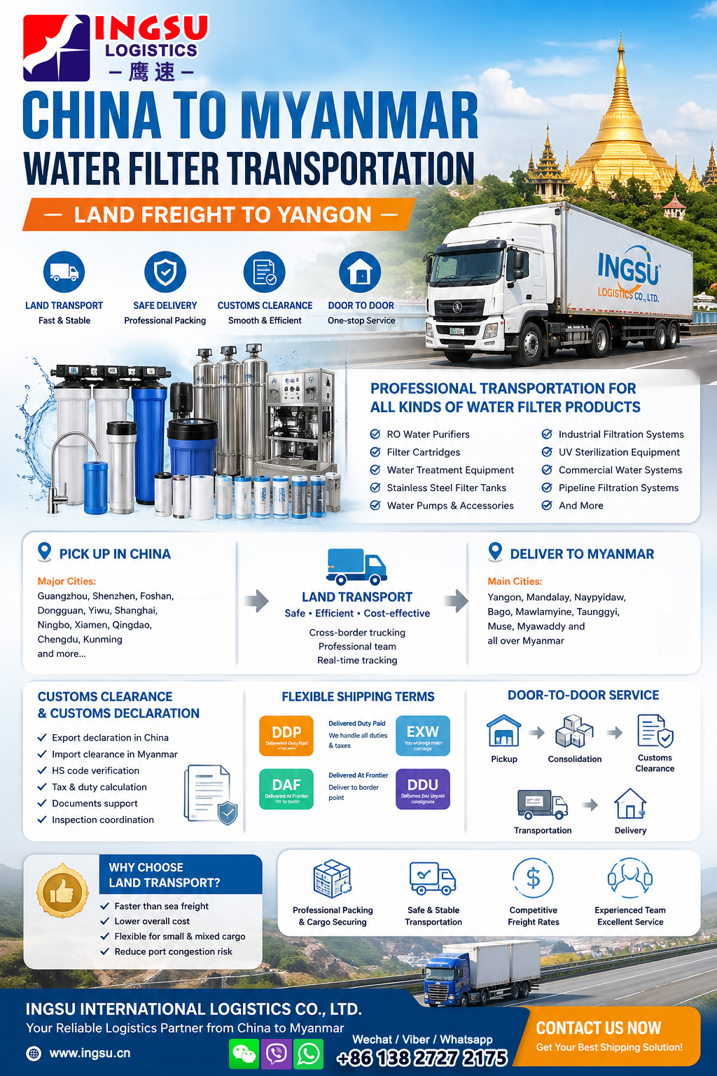 As demand for clean drinking water continues to grow in Myanmar, more businesses are importing water filtration systems, RO equipment, purifier accessories, and industrial water treatment products from China. However, transporting water filters across borders requires more than standard shipping — it demands professional customs handling, safe cargo management, and reliable delivery timelines.INGSU INTERNATIONAL LOGISTICS CO., LTD. specializes in professional China to Myanmar land transportation services for water filters and water treatment equipment, providing a complete one-stop logistics solution from pickup in China to final delivery in Yangon and other Myanmar cities.