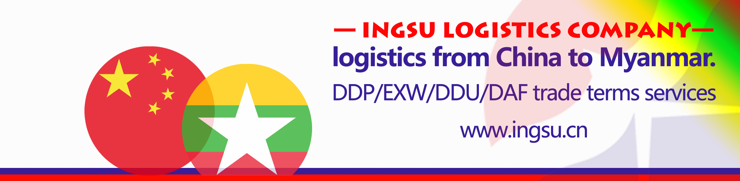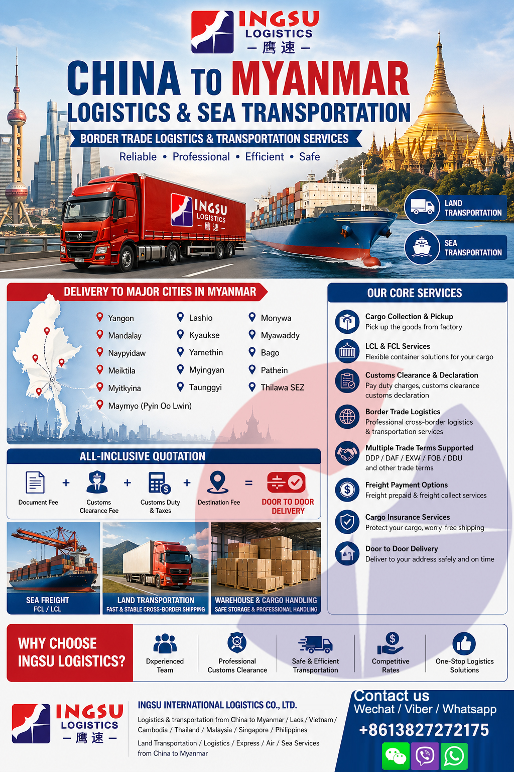 Looking for a professional logistics partner for shipping goods from China to Myanmar?INGSU INTERNATIONAL LOGISTICS CO., LTD. provides comprehensive cross-border logistics and transportation services, including land freight, sea freight, customs clearance, and door-to-door delivery.