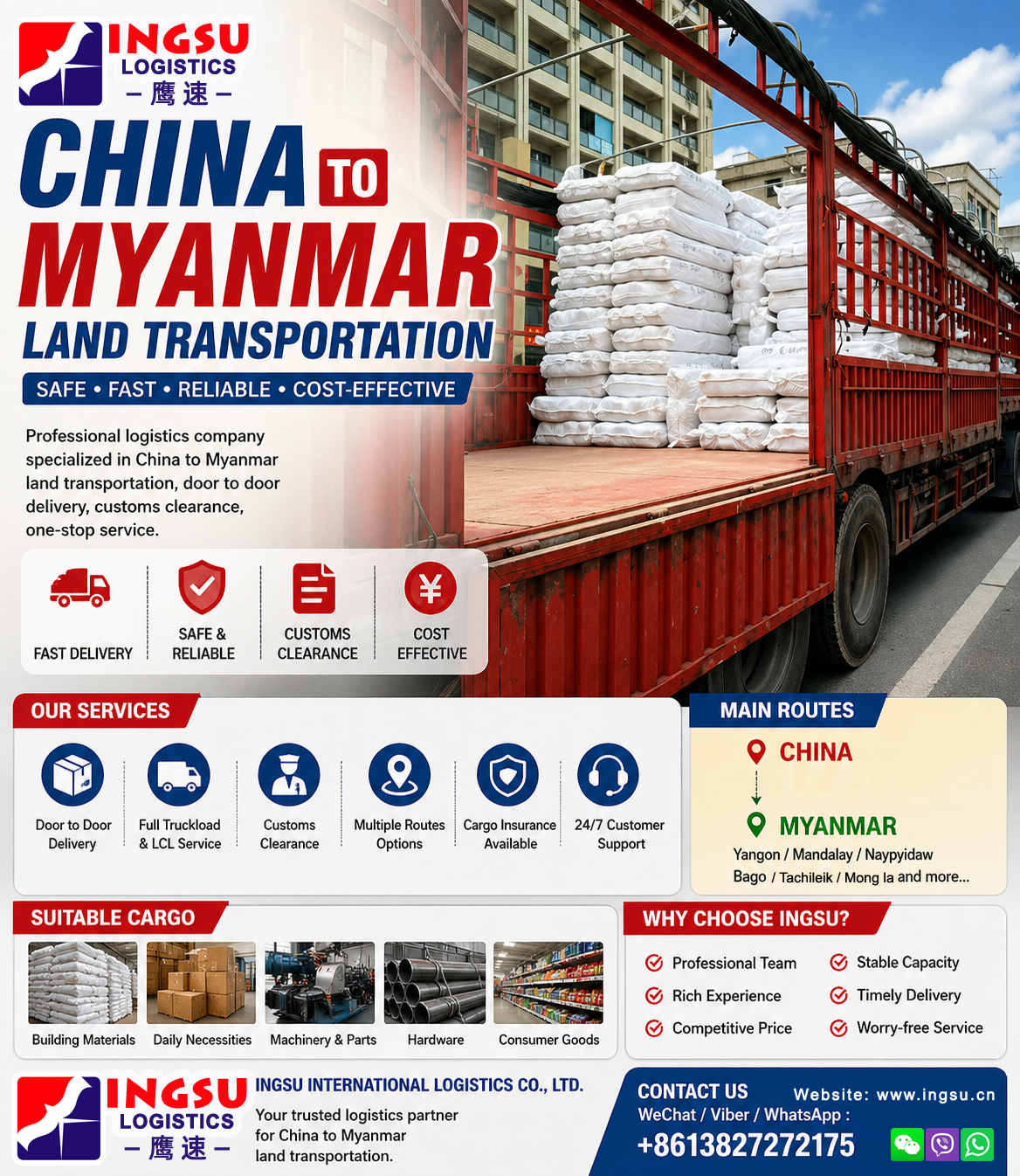INGSU INTERNATIONAL LOGISTICS CO., LTD. specializes in professional China–Myanmar land transportation services, offering one-stop logistics solutions that help companies streamline operations, reduce costs, and ensure smooth cargo delivery.